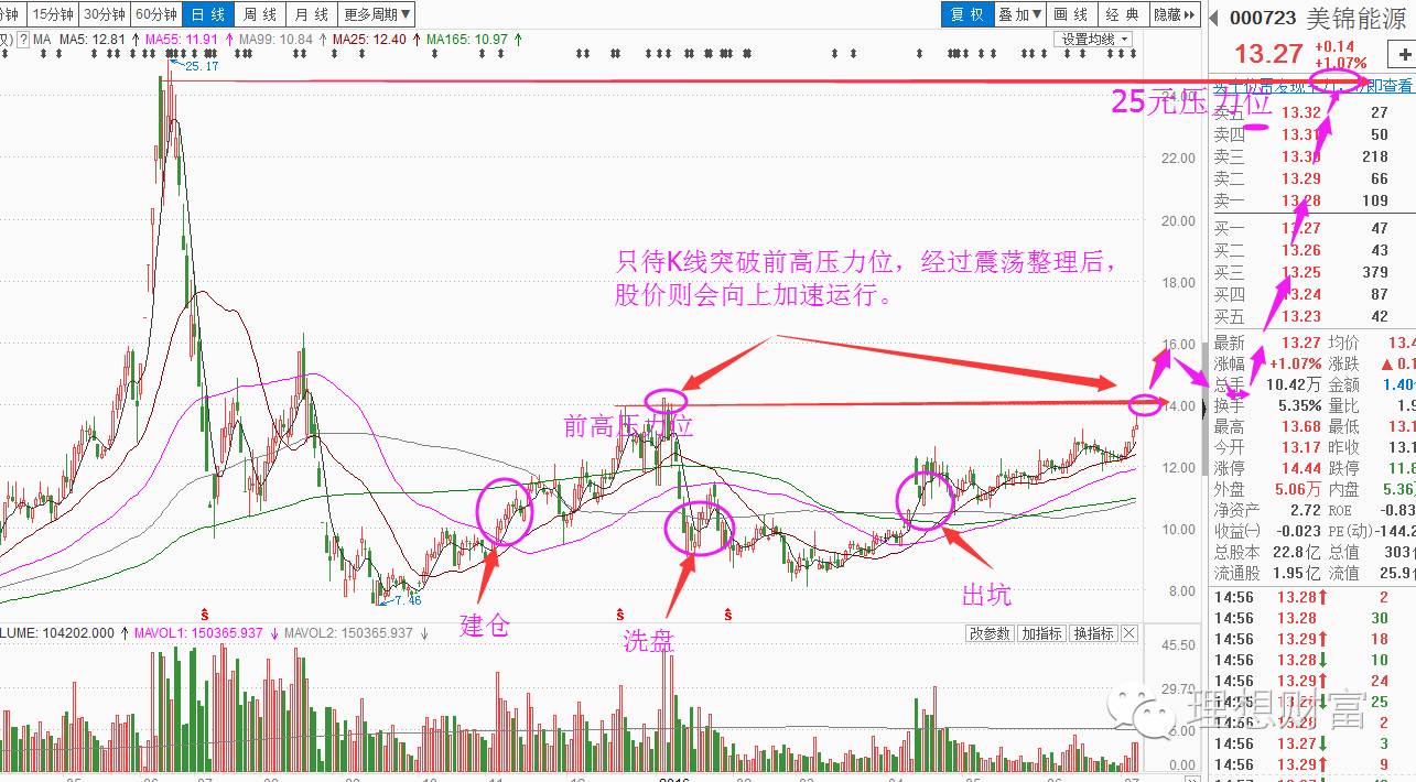 技术分析:美锦能源(000723)主力前期建仓后,中途经过一轮洗盘,股价现已从洗盘“坑中”爬出,只等K线突破前高“套牢盘”压力位震荡整理后,股价则会加速运行。