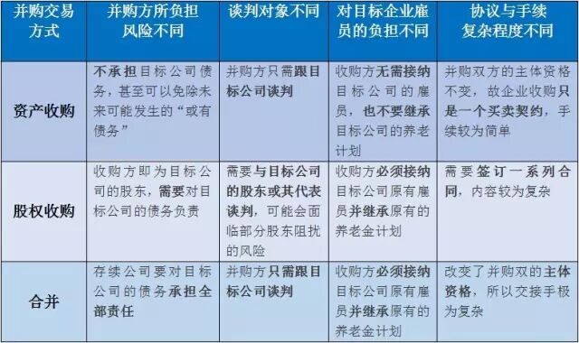横向并购是指两个或两个以上生产和销售相同或相似产品公司之间的并购行为。纵向并购是指上下游企业之间的并购行为。混合并购,意味着目标公司与并购企业既不是同一行业,又没有纵向关系。对于一个全新的领域,需要考虑准备进入的行业的结构特征和市场机会,包括行业预期投资回报率、发展前景、竞争程度、进入壁垒以及产品生命周期等。所谓战略资源,其实就是企业的核心能力。并购方要明白自己已有的关键资源能力是什么,而自身的不足又是什么。其次,还要分析目标企业的战略资源特性和缺陷。最后,要从自身的核心能力出发,从资源互补和协同的角度选择并购对象。并购交易三种方式的异同点![]()