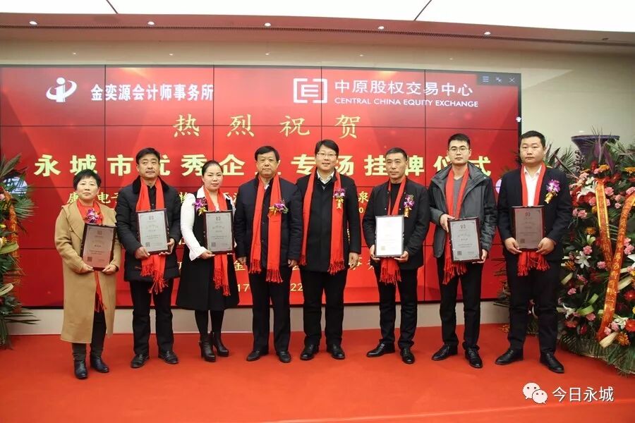 据了解,今年我市共有8家优秀企业在中原股权交易中心成功挂牌,分别是永城启航建材销售有限公司、河南铭起建材设备自动化有限公司、永城农春生物科技有限公司、河南康达电子商务有限公司、永城华龙服装有限公司、永城大元食品有限公司、河南源泉种业有限公司、永城羿天汽车销售有限公司。