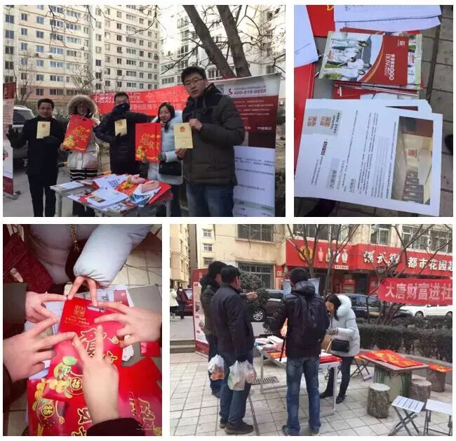 1月23日,兰州分公司不畏严寒进社区,为大家送去特制的新春福袋,同时也为社区居民普及金融知识,帮助客户选择正规的投资机构,做适当的资产配置。兰州分公司此举赢得了市场认可及客户口碑。当地流传的顺口溜这样说道:“大唐财富进社区,金融常识大家知。数九寒天不畏冷,普惠金融心欢喜。”