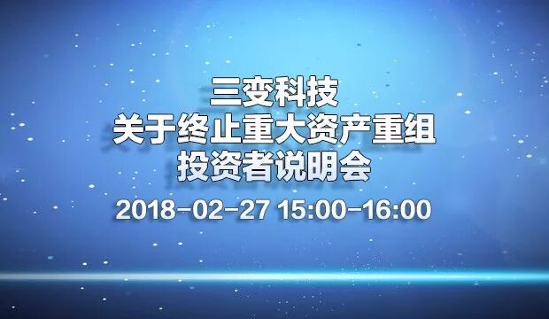 2月27日(周二)15:00-16:00,三变科技(002112)关于终止重大资产重组投资者说明会在全景·路演天下举行,通过“全景·路演天下”平台可与公司高管互动交流!