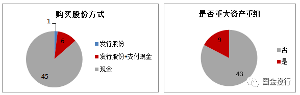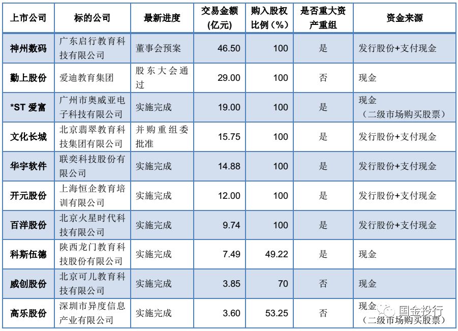 涉及发行股份的并购案均构成了重大资产重组,其中,仅发行股份而没有现金对价的四通股份收购启行教育(45亿)于2017年2月已经终止,2017年12月,神州数码针对同一标的公布了46.5亿元定增收购交易的报告书。另外,涉及发行股份的还有百洋股份收购火星时代、华宇软件收购联奕科技、开元股份收购恒企教育和中大英才、文化长城收购翡翠教育(实施中)。