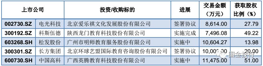 就交易金额来看,多数集中在5千万元以下、1亿元至4亿元这两个范围,金额最高的交易为神州数码拟收购启行教育(46.5亿)。