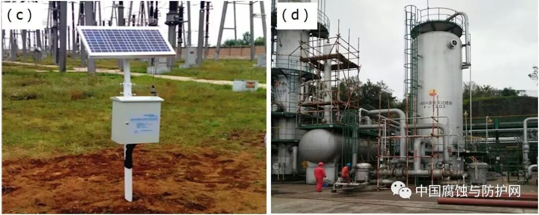 图8高压天然气管线氢通量腐蚀监测(a),油田联合站腐蚀监测与缓蚀剂智能加注系统(b),220kV接地网土壤腐蚀监测网络(c),以及天然气净化厂回收塔腐蚀监测现场照片(d)