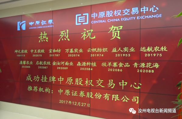 12月27日,在郑州市郑东新区商务外环23号中科大厦六楼会议室,中原证券推荐我市坤元农牧、万基实业等13家企业在中原股权交易中心挂牌。市领导姚军柱、史清秀、余占营、翟会杰及中原股权交易中心董事长赵继增出席挂牌仪式。