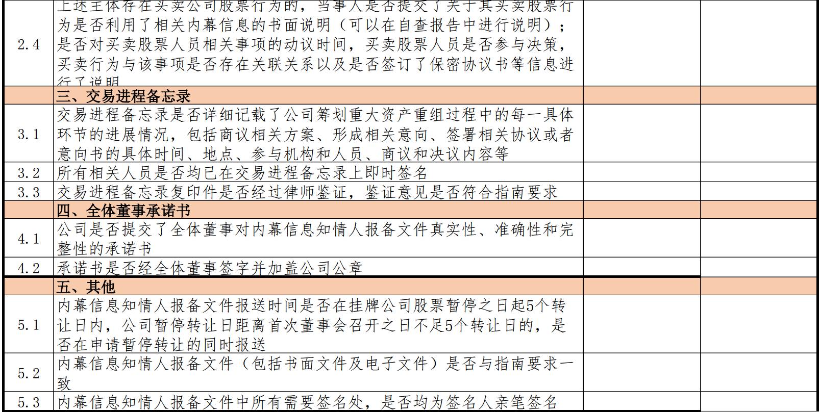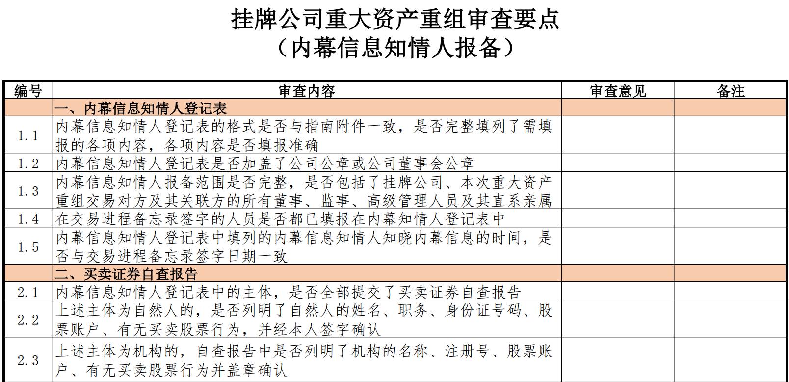 一、《审查要点》主要对挂牌公司重大资产重组中内幕信息知情人报备、首次信息披露(包括披露重组预案和披露重组报告书两种情形)及发行股份购买资产备案等三个环节的审查要求予以明确。