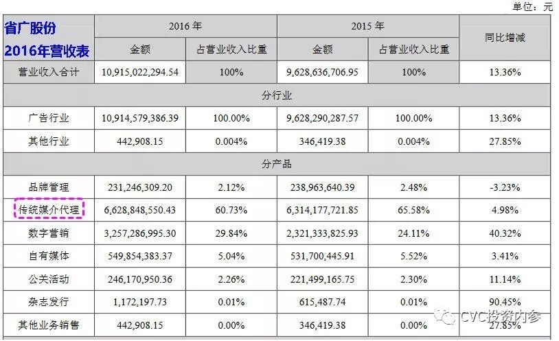 省广股份2010年5月IPO每股发行价格39.80元,市值约33亿元,2009年营收20亿元;当前市值112亿元,2016年营收109亿元,传统媒介代理业务仍占比60%,但呈现逐年下降的趋势,且毛利率也下滑到12.9%,而新的数字营销业务则增速明显,毛利率还要高出六个点。![]()