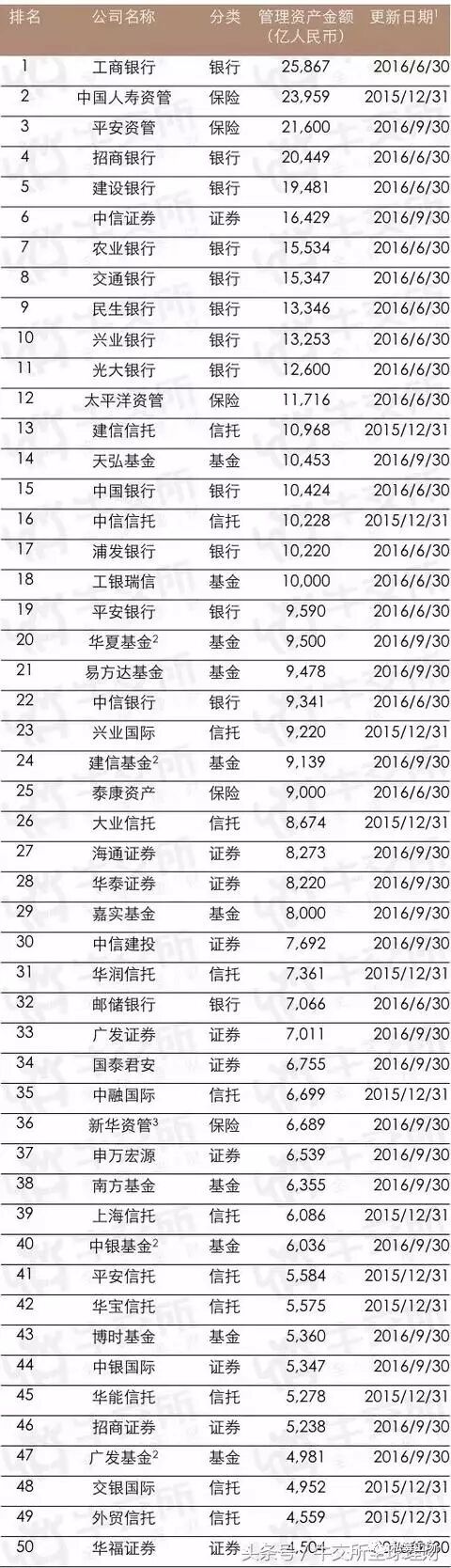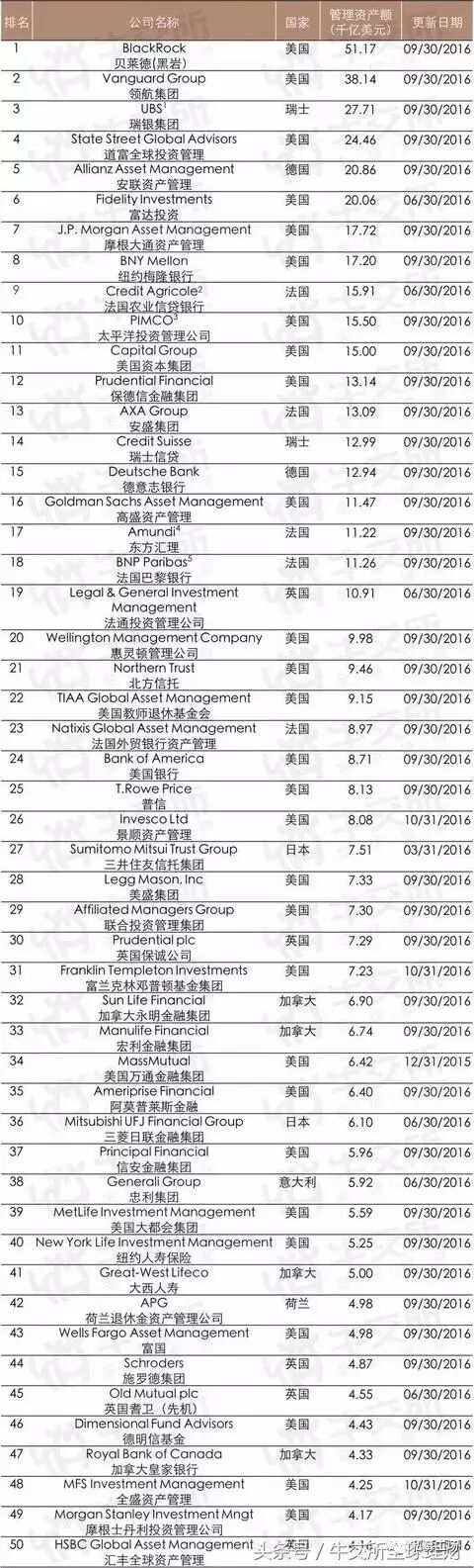 全球前50大资产管理公司最新排名(大部分截至2016年3季度):