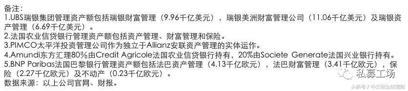 一般,托管机构不应该算资产管理公司,因为他们不能主动管理这些资产。全球最大的托管银行为道富银行(State Street)。但道富也同时拥有资产管理业务,榜单中排名第4的就是道富资管部分的规模,不包括托管的资产规模。(科普下,不是只有银行才能做托管,而且不仅现金,证券也是可以托管的。)