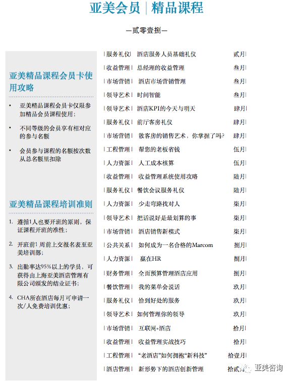 上海亚美酒店管理有限公司作为美国饭店教育学院(EI)上海代表处,提供从总经理到一线员工,20多种职业认证。通过美国饭店教育学院的认证不仅能得到客人、同事和雇主的认可、 优秀职业能力的证明,更是自我提升与激励以及崇高的职业荣誉。对了,第20期CHA(国际酒店注册总经理)又开始招生啦,详情见第20届国际注册酒店总经理研修班,开班啦!