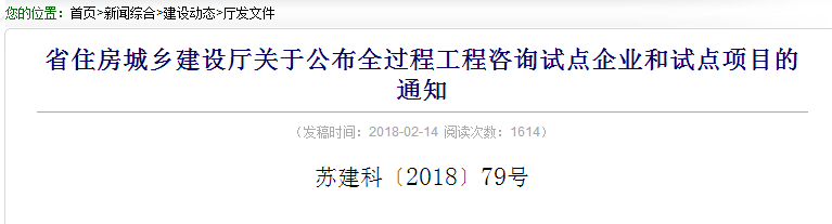 根据《省政府关于促进建筑业改革发展的意见》(苏政发〔2017〕151号)《江苏省开展全过程工程咨询试点工作方案》和《江苏省住房城乡建设厅关于推荐全过程工程咨询试点企业和试点项目的通知》(苏建科〔2017〕556号),经企业自愿申报、各设区市建设局(委)推荐、我厅审核,现将我省全过程工程咨询试点企业和试点项目名单予以公布(具体名单详见附件),并就有关事项通知如下: