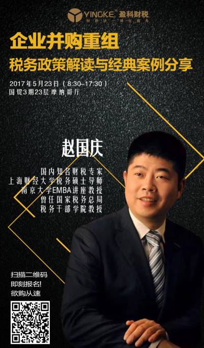 为加强财税、法律、资本市场领域同仁之间的合作交流,拓展业务领域,提高业务水平,盈科律所资本市场部、盈科律所律师学院、盈科商学院、盈科财税将于2017年5月23日联合举办“企业并购重组税收政策解读及经典案例分享”,诚邀各位同仁参加。本次培训特邀国内顶级知名财税专家赵国庆老师为主讲人,力求多层面解读金融税收、并购重组与VIE投资架构等法律操作实务。